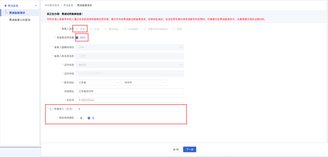 填寫上年度收入(個(gè)人費(fèi)減要求為上年度收入低于6萬元),勾選對(duì)應(yīng)的年份及是否接收短信通知,填好后點(diǎn)擊下一步。