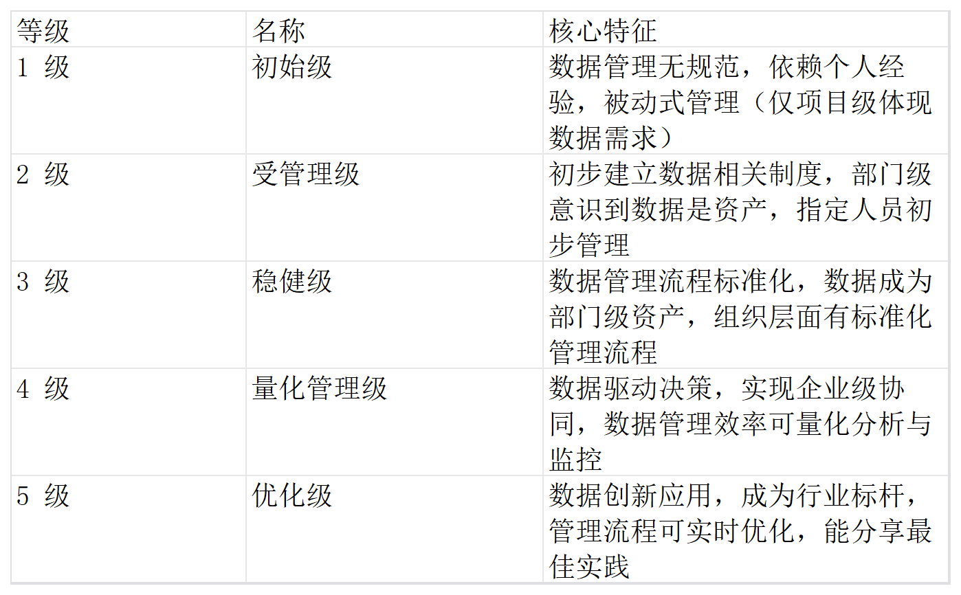 等級從低到高對應(yīng)企業(yè)數(shù)據(jù)管理能力逐步提升,核心特征如下: