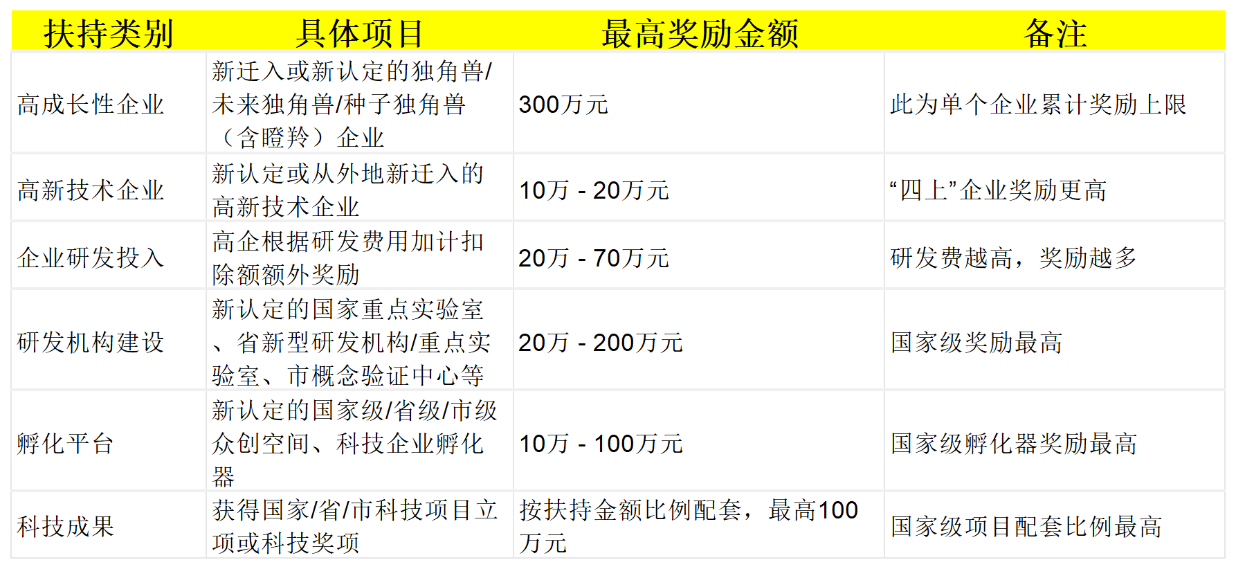 2. 主要扶持對(duì)象與獎(jiǎng)勵(lì)標(biāo)準(zhǔn):政策為不同類(lèi)型的企業(yè)和創(chuàng)新平臺(tái)提供高額資金獎(jiǎng)勵(lì),主要類(lèi)別和最高獎(jiǎng)勵(lì)如下: